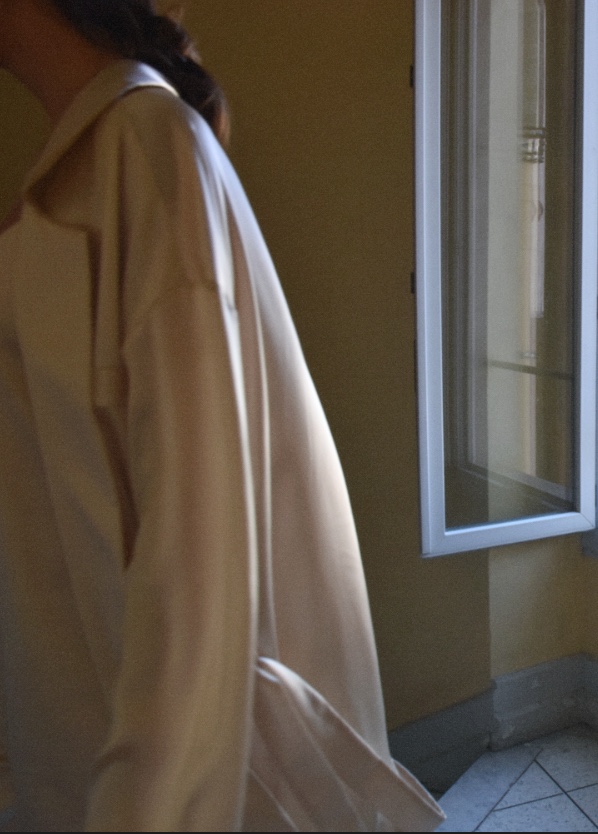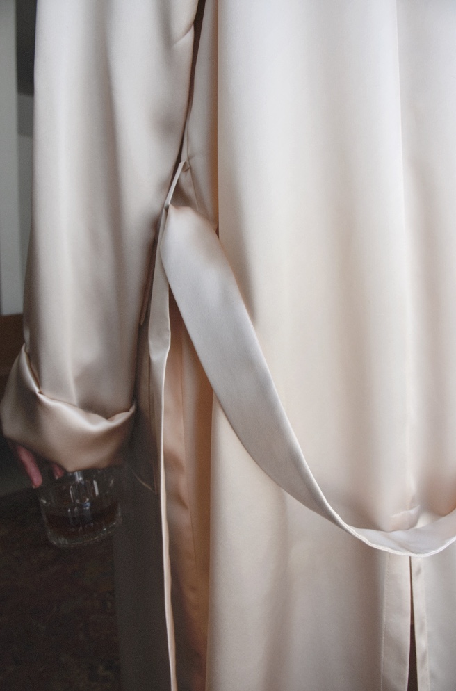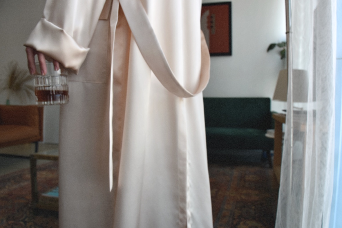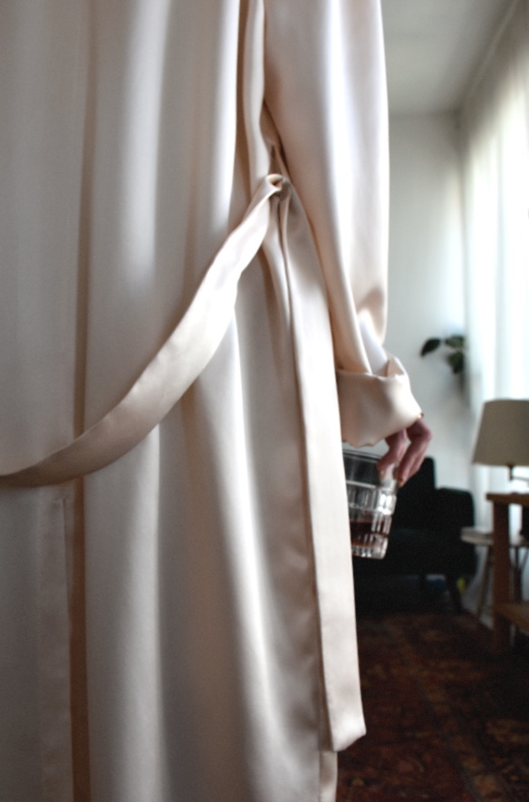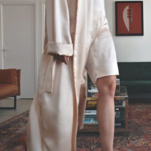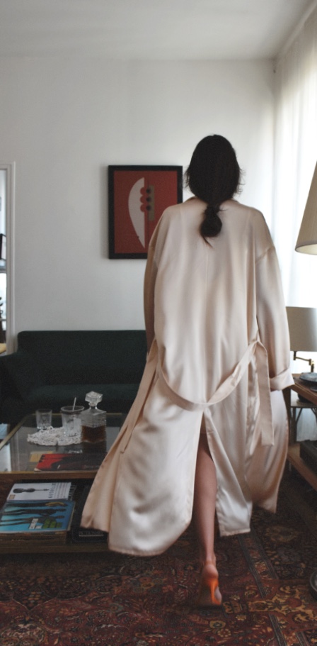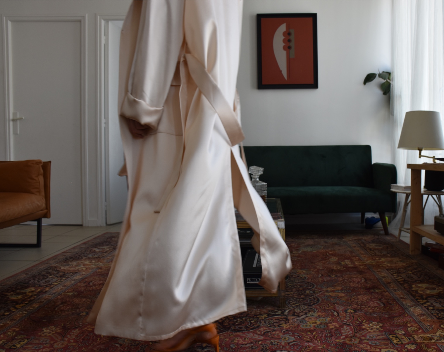 This piece is handmade to order and required 33 hours of work and 5 yards of silk charmeuse. The silk elected is 100% grade A from Mulberry silk. As a shoulders to feet piece, don’t hesitate to give us your size to custom your coat. It’s all made to order so we can custom each order to fit you perfectly. Every women and bodies are unique.